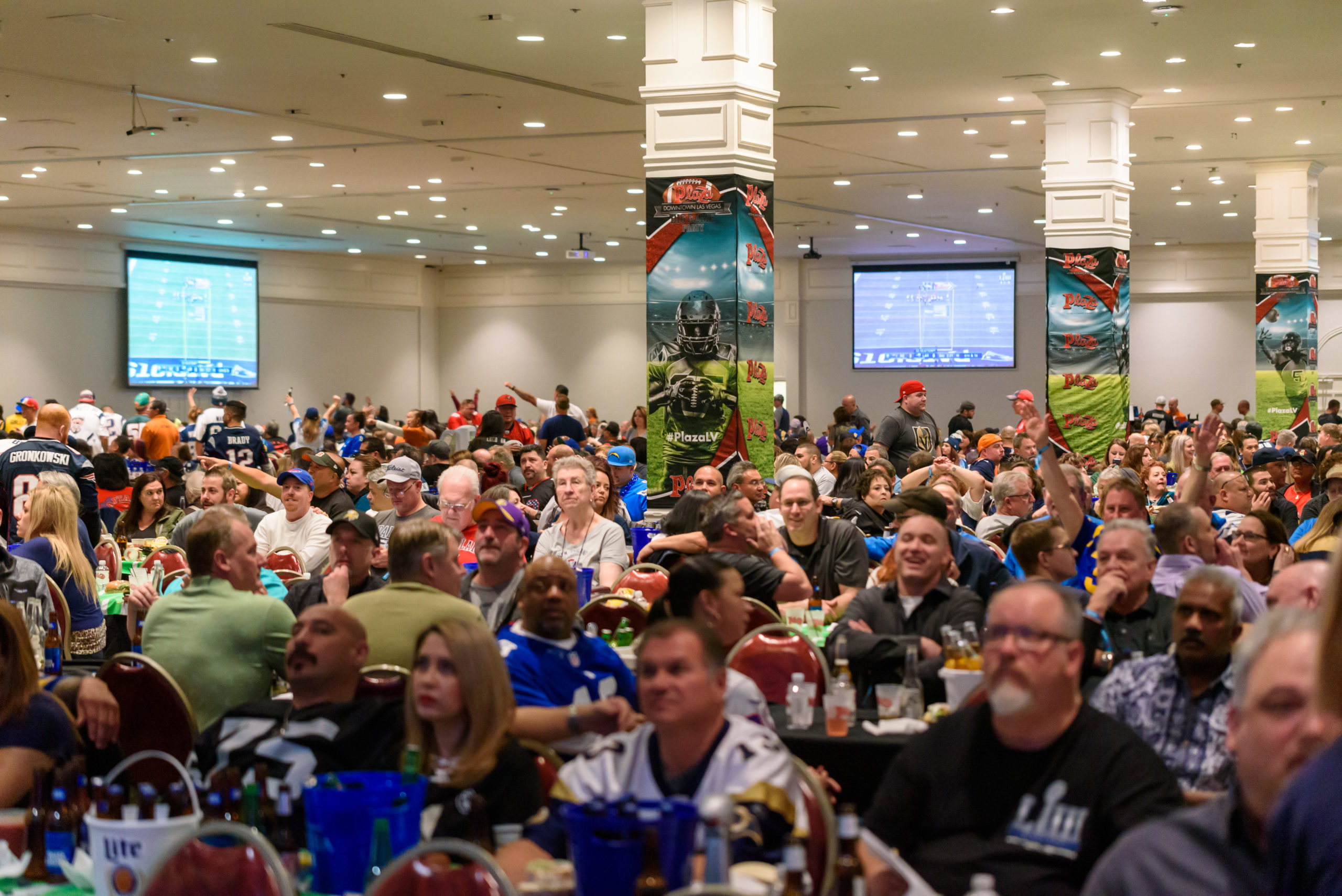 LAS VEGAS – The Plaza Hotel & Casino will hold its annual Big Game Viewing Party on Sunday, Feb. 12 inside its expansive convention space on its third floor. Football fans, 21 years of age or older, will enjoy a stadium food buffet and buckets of beer at the viewing party where they will be surrounded by the Big Game broadcast on giant high-definition screens. Doors open at noon.
