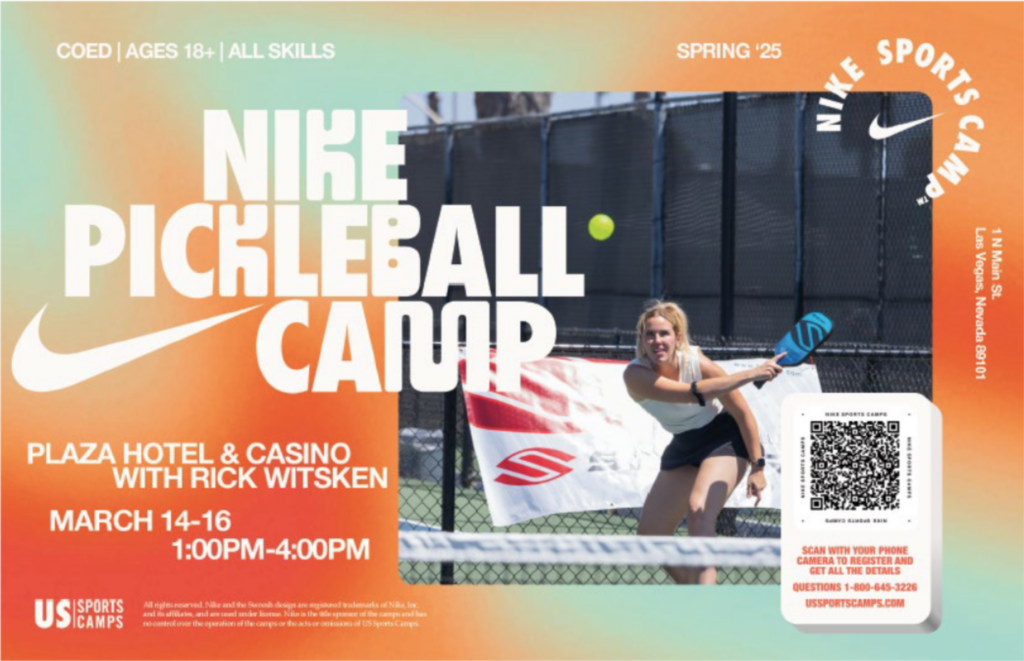 LAS VEGAS (Feb. 27, 2025) – Offering 13 rooftop pickleball courts, the most of any Las Vegas resort, the Plaza Hotel & Casino in downtown Las Vegas will host a three-day Nike Pickleball Camp led by nationally-ranked professional pickleball player Rick Witsken, Friday, March 14 through Sunday, March 16, from 1 to 4 p.m. each day.