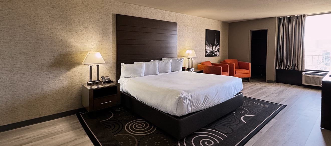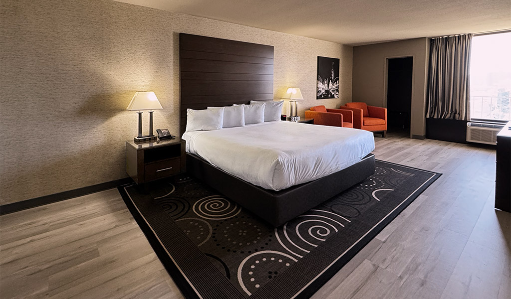 Our one bedroom suites (approximately 650 square feet) come with a living room parlor, a total of 1.5 bathrooms, in-room safe, multiple flat-screen televisions with premium cable channels, mini refrigerator, coffee maker, wet bar and all of our deluxe room amenities. Each bed features luxury bedding with fresh and crisp triple sheeting and select pillows.
