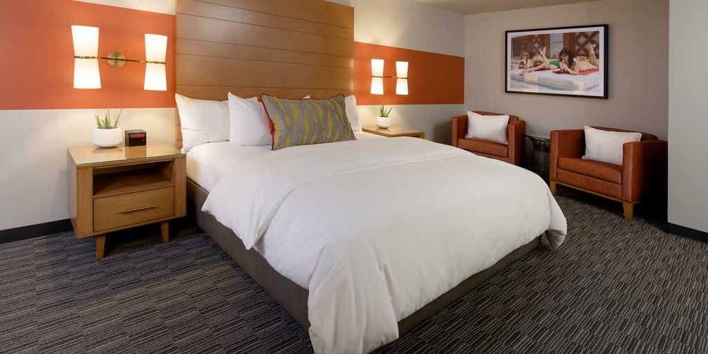 Our one bedroom suites (approximately 650 square feet) come with a living room parlor, a total of 1.5 bathrooms, in-room safe, multiple flat-screen televisions with premium cable channels, mini refrigerator, coffee maker, wet bar and all of our deluxe room amenities. Each bed features luxury bedding with fresh and crisp triple sheeting and select pillows.